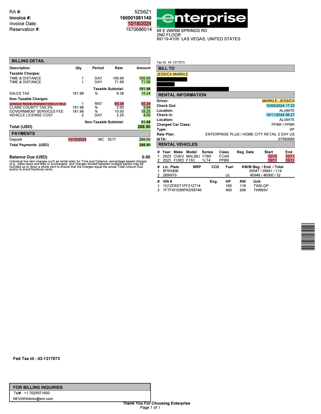 → View Rental Agreement — Version 1 — PDF → View Rental Agreement — Annotated Version — PDFThe credit card was charged $288.90 on October 9, 2024 — the same day the vehicle was picked up. At the moment Enterprise swiped the card, they did not know the final rental duration. They did not know the exact destination. They did not know what the final invoice would total. And yet the charge landed at a very specific, fixed number.